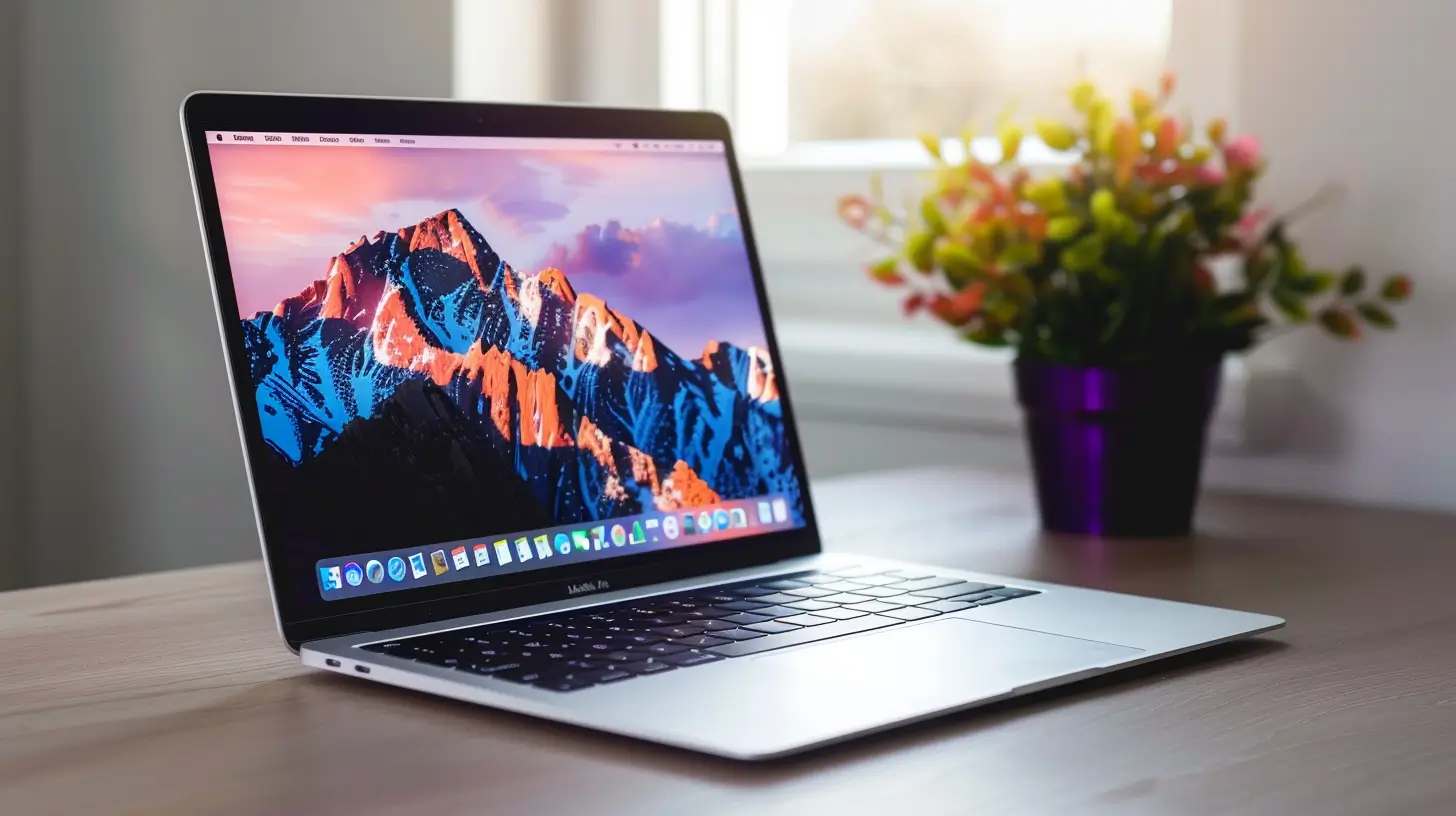 En MacBook Air M4 ligger öppen på ett träbord nära ett fönster, med en tapet med ett bergslandskap och en krukväxt i en lila kruka i bakgrunden - perfekt för att skriva din nästa MacBook Air M4 recension.